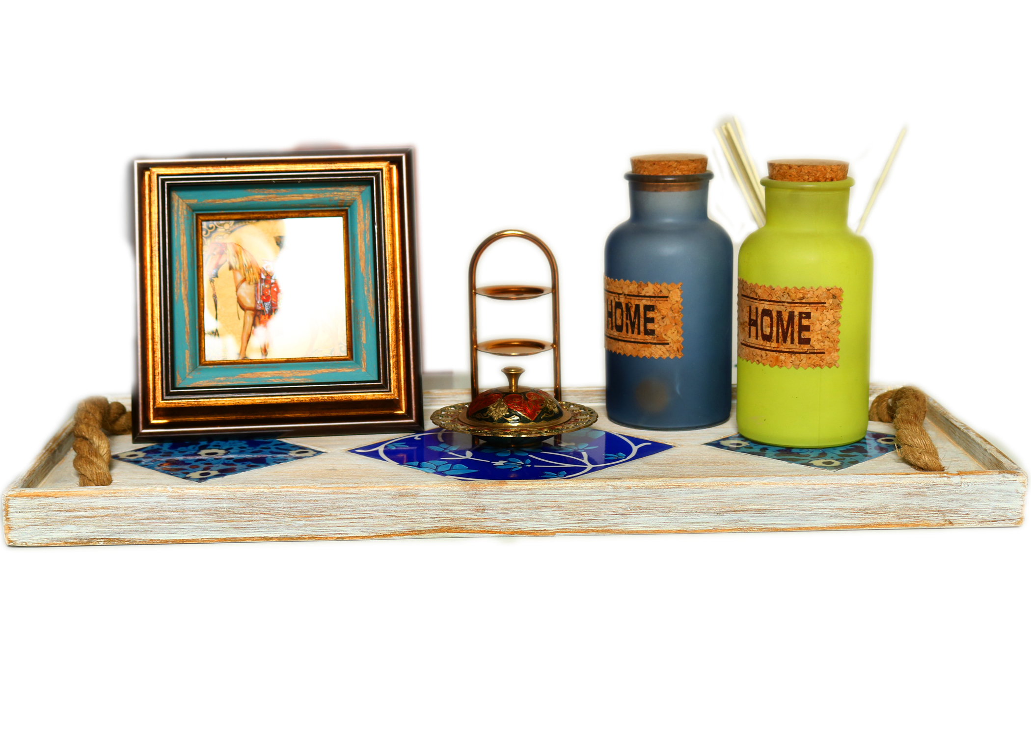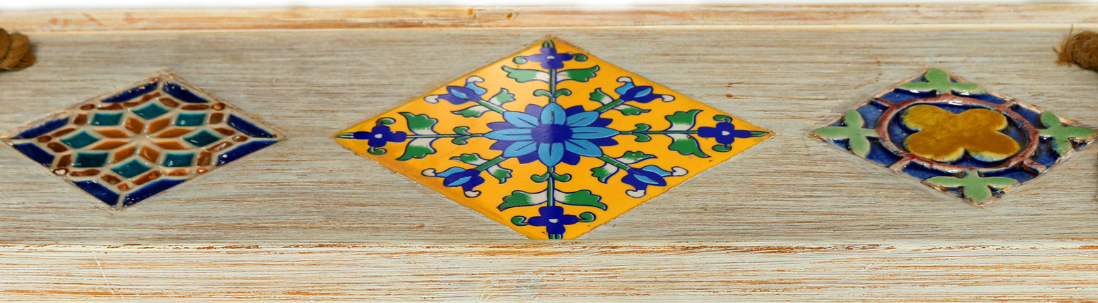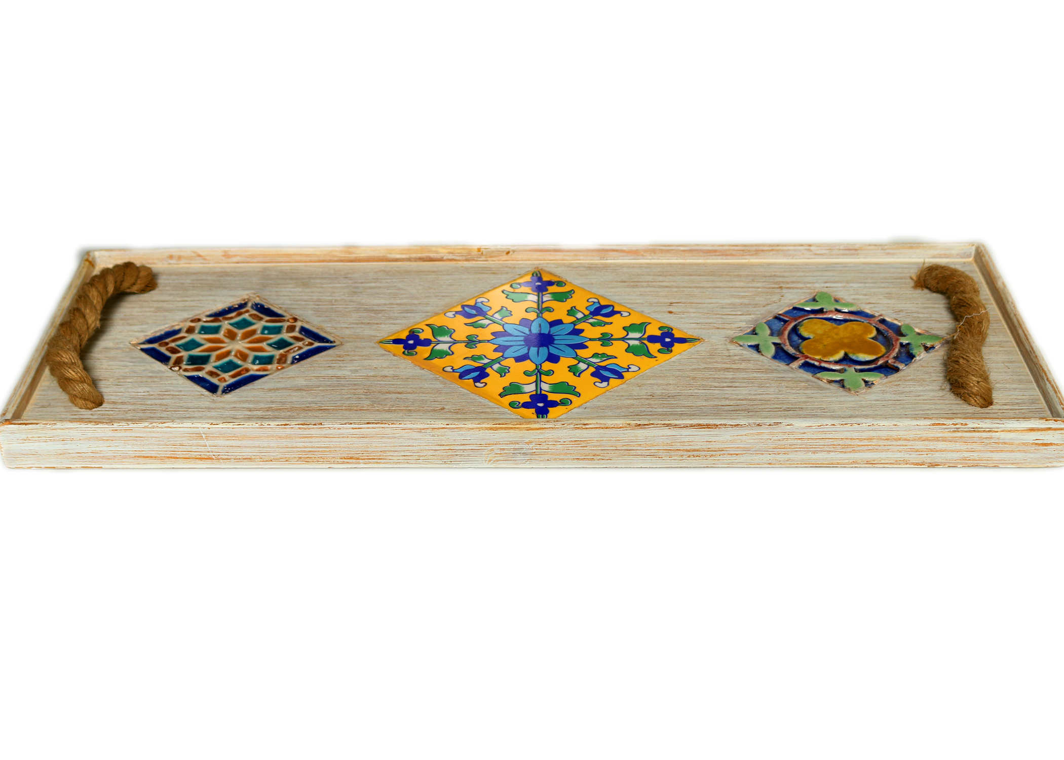 Serving Tray, Vintage Serving Tray, Rustic/Chalk Finish, Himalayan Spruce Wood, Hand Painted Ceramic Tiles Fitted, Rectangular, Serving Tray, Large Ottoman Tray with Hemp Rope Handles, Wooden Tray Decorative, with matte finish