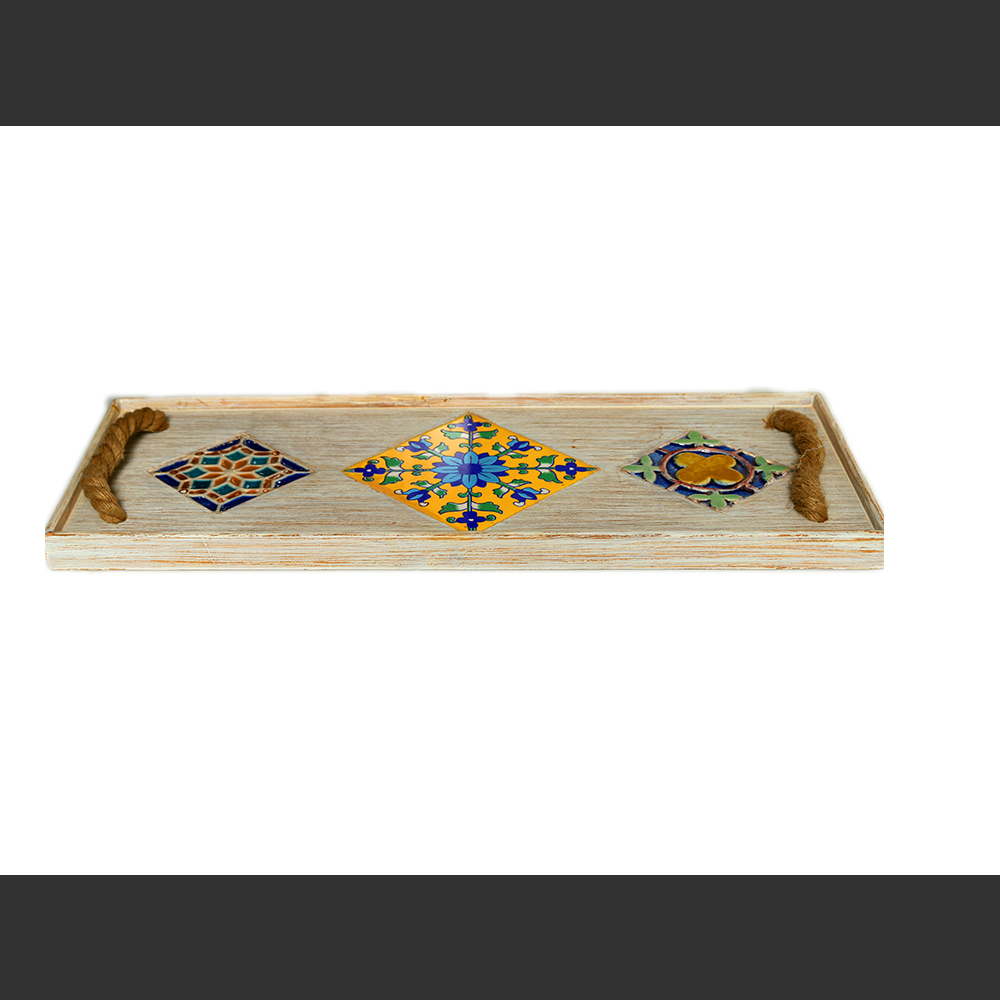 Care Instructions: Do not put the tray in a microwave oven, or expose to direct heat. Clean with a damp cloth, do not wash in water. Fitted with multi coloured hand painted ceramic tiles. Safe to use for food servings. Weighs 3.30 Ibs (approx).